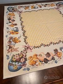 Tovaglia-centrotavola pasquale. Dimensioni cm 100x100. 40% cotone, 36% poliestere, 24% acrilico. Made in Italy.