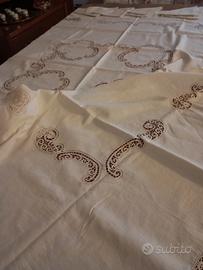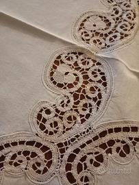 Tovaglia realizzata a mano con applicazioni di pizzo Cantù . Completa di 8 tovaglioli tutto rifinito con merletto tombolo ad ago. Senza difetti o macchie . Mai utilizzata. Misure tovaglia 180 x 170 cm.