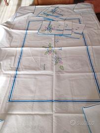 Tovaglia cotone Mulino Bianco -ricami 1992- con fiori e rondini, cm.140x170. Completa di 6 tovaglioli cm. 36x36. Nuova, conservata in un cassetto e mai usata.