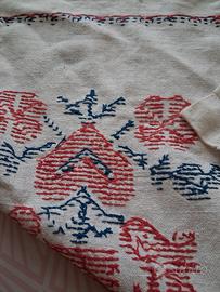 tovaglia d'epoca ricamata a mano in lino grossolano rustico artigianale con fiori rossi e bianchi ricamati a punto croce