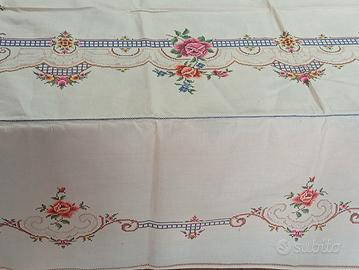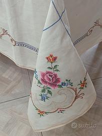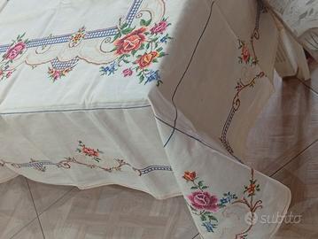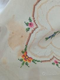 bellissima tovaglia, pezzo raro .. è nuova ma purtroppo presenta alcune macchie di conservazione perché fa parte di un antico corredo per questo ha bisogno di un lavaggio di mani esperte x farle sparire. dal vivo è un incanto. bellissima