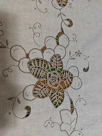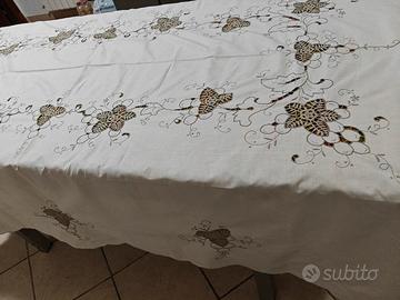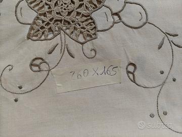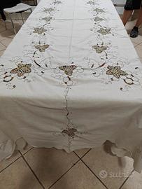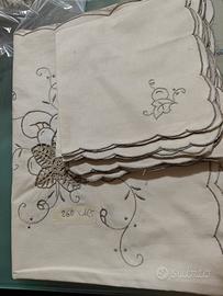da un corredo degli anni 70 tovaglia da 12 con pizzi e ricami. nuova mai usata né lavata in perfette condizioni.. le misure sono 260X165 con 12 tovaglioli nel mio profilo troverai solo pezzi antichi e vintage originali. prezzo non trattabile