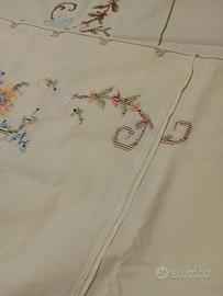 Amabile e armoniosa tovaglia vintage color crema ricamata a mano a punto croce arricchita da applicazioni in tessuto. Dimensione 210 x 168 cm. Completa di 8 tovaglioli 40 x 40 cm. Mai usata solo rinfrescata per la vendita. Realizzata su tre teli di tessuto di cotone.