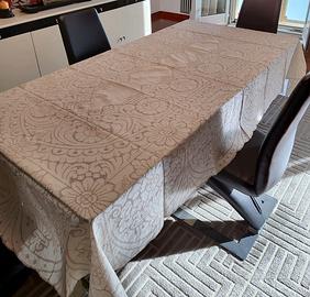 Tovaglia rettangolare da 12, completa di tovaglioli purtroppo sporchi di macchie da cassetto, colore beige, con ricamo sfilato siciliano écru, in lino. 255x170. Mai utilizzata