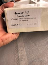 Tovaglia 12 persone in pizzo in tulle ricamato da corredo. Ancora nella confezione originale, mai usata