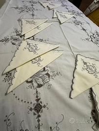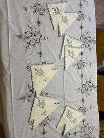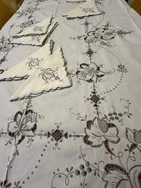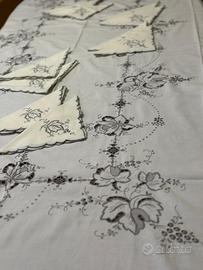 tovaglia antica in puro lino, ricamata a mano con motivo floreale grigio su sfondo bianco, corredata da tovaglioli abbinati.