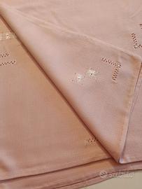 Tovaglia rettangolare da 6 commensali rosa confetto ricamata in bianco da corredo usata 2 volte lavata e stirata come nuova. Cotone misto e ricami bianchi a macchina