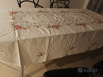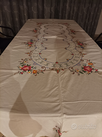 Vendo tovaglia in cotone lavorata a mano punto croce e uncinetto, larga 230x280, bellissima.