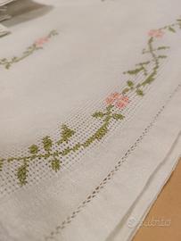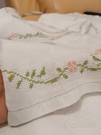 Vendo tovaglia ricamata a mano soggetto floreale in puro cotone con annessi 12 tovaglioli. Vintage in buone condizioni.
