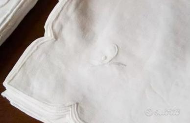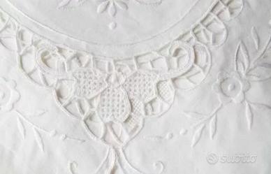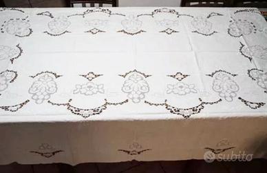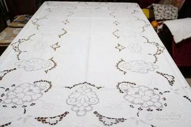 Antica tovaglia da tavola per 12 persone con tovaglioli in puro lino bianco in pizzo di Burano impreziosito da intaglio e ricamo a grappoli. Le foto non mostrano la bellezza reale di questo completo tavola. Mai usato e perfettamente conservato, senza segni di tempo. Le misure sono: 260x166cm la tovaglia; 42x40 cm i tovaglioli. Pezzo unico. Vendo per dismissione corredo. Per ulteriori info non esitate a contattarmi.
