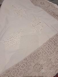 applicazioni in pizzo, orli e inserti in uncinetto, intaglio nei tovaglioli.