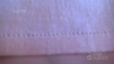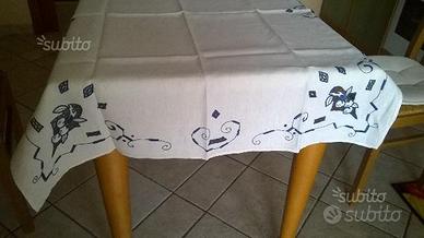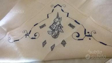 Tovaglia da tè vintage in lino color ecrù chiaro, interamente ricamata a mano in blu e finitura con orlo a giorno. Mai usata, solo rinfrescata. Non presenta macchie gialle. Senza tovaglioli.
