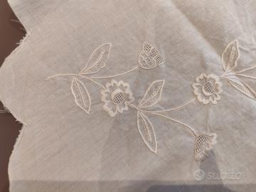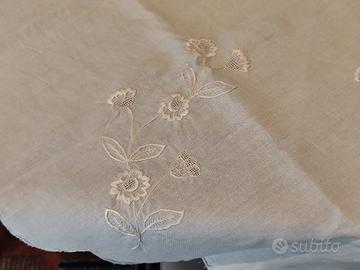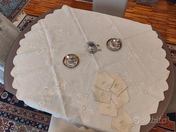 raffinatissimo set da te, tovaglia rotonda in lino, bianco perla con 6 tovaglioli ricamato tono su tono