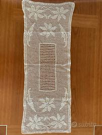 Tovaglia bianca in lino intagliato a mano con decoro floreale per servire il te con eleganza.