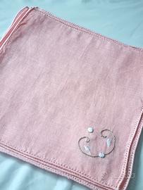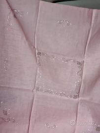 Bellissima tovaglia quadrata di bisso da the color salmone ricamata a mano completa di 6 tovaglioli