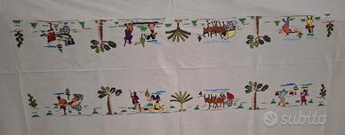 tovaglia in cotone grezzo, resistente, color panna, 240 x 140 cm con 6 tovaglioli 22x 12 cm con un angolo ricamato. Ricami eseguiti a mano da ragazze sostenute dall' associazione h&t odv a cui va l offerta, con personaggi della vita quotidiana. Al centro della tovaglia ricamo di 120 x 40 cm. n 15 ricami lungo i 4 bordi.
