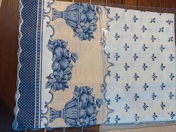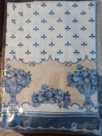 Tovaglia nuova di cotone nella confezione originale. Misure 180x140 per 6 coperti. Bianco panna con stampa floreale blu e beige. Perfetta per una tavola elegante.