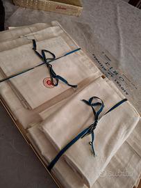 Originale tovaglia di fiandra tessuto operato tela di lino e finitura a punto a giorno, completa di 12 tovaglioli Colore panna/beige Mai aperta, qualche lieve alone dovuto alla lunga conservazione In confezione d'epoca