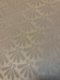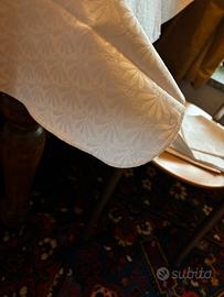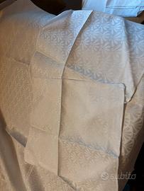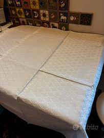 Nuova! In raso damascato, bianca. Angoli arrotondati. Misura tovaglioli 33x34 cm. Tovaglia 125x110 cm