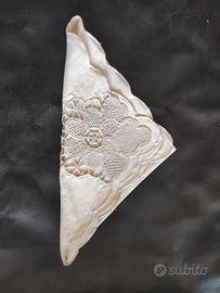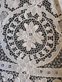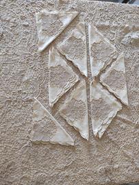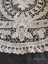 tovaglia rotonda da otto persone fatta a tombolo con fantasia floreale abbinata ai tovaglioli con fiore