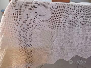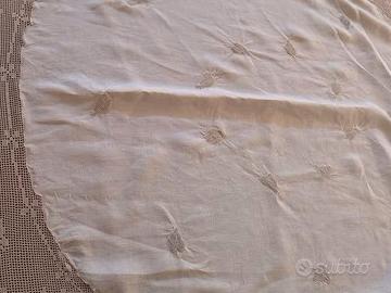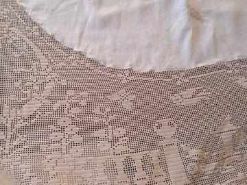 Vendo tovaglia antica realizzata oltre 70 anni fa mai utilizzata. La parte centrale tonda è in lino con ricamo di foglioline di 95 di diametro, la restante parte è realizzata ad uncinetto misure 160x 150. Può essere utilizzata sia su un tavolo tondo che su uno semi quadrato. Tonalità beige .Mai usata