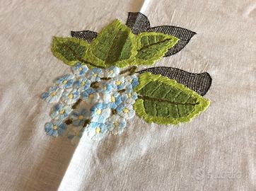 Tovaglia in bisso di lino ricamata a mano con disegni di ortensie rosa e celesti realizzata da manifatture fIorentine anni 50/60 e facente parte di un corredo di quegli anni. Inottime condizioni.