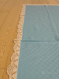 Tovaglia rettangolare in cotone di alta qualità, color azzurro polvere con delicata trama a piccoli scacchi jacquard. L'articolo è impreziosito da un ampio bordo in pizzo/merletto color panna, interamente lavorato a mano all'uncinetto con estrema cura nei dettagli.