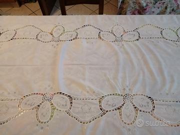 Vendo tovaglia bianca in cotone con inserti a ucinetto della nonna. Posti 8