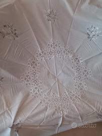 Bellissima tovaglia rotonda bianco in cotone con inserto centrale in pizzo Rinascimentone sull orlo con delicati ricami grigio con 8 tovaglioli tovaglia vintage mai usato