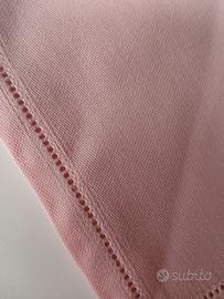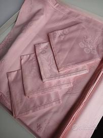 Tovaglia mai usata 160 x 116 degli anni 80 con 6 tovaglioli rosa 46x46. E' stata conservata nella sua confezione originale in cartone e Il colore potrebbe essersi un po' sbiadito nel tempo.