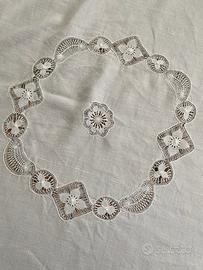 Tovaglia rotonda 180 cm con sei tovaglioli in lino e merletto a tombolo.