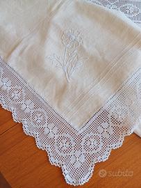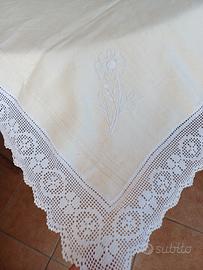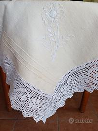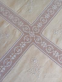 Tovaglia quadrata in lino grezzo, caratterizzata da un design elegante con ricami interamente lavorata a mano.