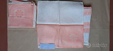 Tovaglia in lino mai usata, con 12 tovaglioli Colore arancio e bianco. Misura tovaglia 170x140cm. Tovaglioli 44x45cm. C0ndizioni perfette. 50€