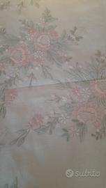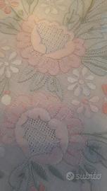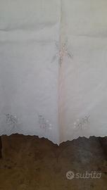 Tovaglia in lino ricamata a mano da 12 coperti con tovaglioli grandi e piccoli. Lunghezza mt.2.86 larghezza mt. 1.72. Nuova mai usata.