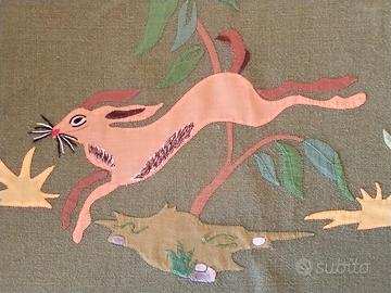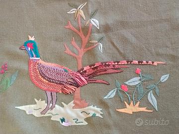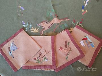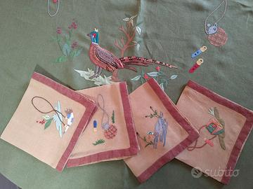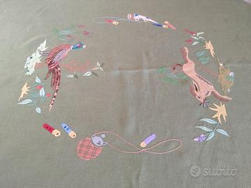 Tovaglia rotonda vintage anni '60 in lino con ricami sul tema della caccia. Si tratta di un pezzo d'artigianato capace di trasformare una tavola in un racconto di altri tempi e che non è solo un complemento di arredo, ma un vero e proprio pezzo di collezione. La base è in lino di alta qualità caratterizzata da una traccia corposa e leggermente irregolare che conferisce un aspetto rustico, ma estremamente sofisticato. I colori spaziano dal marrone al senape al verde e richiamano i colori della terra mettendo in risalto la precisione dei ricami. l tema della caccia si snoda nel centro tavola attraverso ricami eseguiti con filati di cotone, seta e ricami appliquè. Protagonisti della scena sono una lepre in corsa ed un fagiano dalle piume variopinte entrambi immersi in simboli venatori quali corni da caccia, bossoli di fucile, carnieri tra loro intrecciati da nastri e da flora di bosco. La pesantezza del lino permette alla tovaglia di scendere elegantementre su un lato del tavolo mantenendo le piegfhe composte. La tovaglia è completata da n° 8 tovaglioi quadrati ciascuno ricamato con un motivo sempre sul tema della caccia: un carniere, un corno, un'anatra, un uccello, una borraccia, una lepre, una cartuccera, un paio di stivali. La tovaglia è in ottime condizioni, usata raramente con lievi segni di usura e dell'età. Dimensioni: tovaglia diametro cm 170 - tovaglioli cm 41 x 41.