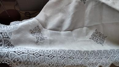 elegante tovaglia di sicuro effetto visivo, in puro lino e pizzo Calais. completa di 12 tovaglioli. nuova . Per chi lo desidera si può completare il corredo con lenzuolo matrimoniale e copriletto uguale.