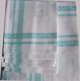 La tovaglia ha preziosi motivi jacquard come da foto, è bianca con eleganti riquadri jacquard verdi pastello (non è stampata).