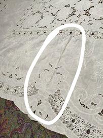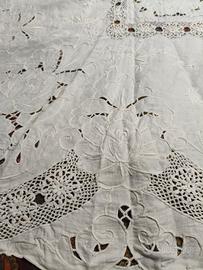 Antica tovaglia in lino bianco,intaglio e vari ricami. Con un alone di conservazione,segnalato in una foto.
