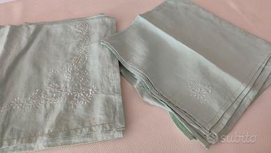 Tovaglia, con 12 tovaglioli, in lino ricamata a mano nuova mai usata 170x275 verde pallido con ricamo bianco