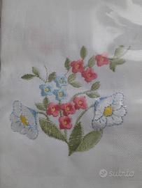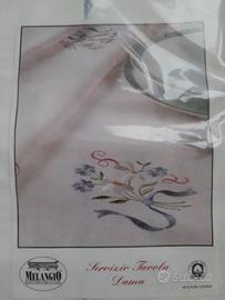 Tovaglia Melangio rettangolare (180 cm x 140 cm) con 6 tovaglioli. In cotone e lavorazione artigianale. Nuova, mai usata e presente nell'incarto della casa madre.
