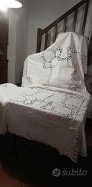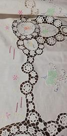 MAI USATA. Elegantissima tovaglia anni '30 in misto lino, interamente ricamata a mano (v. a rovescio ultima foto) e preziosissimi inserti all'uncinetto che scorrono anche lungo il bordo. Misure maxi. Completa di tovaglioli ricamati su un angolo (ancora pinzati tutti assieme).