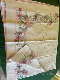 Tovaglia in cotone tonda motivo floreale , mai utilizzata, con 6 tovaglioli in cotone. Colore rosa. Tutto in puro cotone
