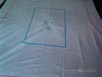 Tovaglia del Mulino Bianco con al centro ricamo di fiori e rondini e scritta Ricamo 1992 dimensioni cm. 148x174 + 6 tovaglioli cm 34x34 mai usata ancora sigillata con Scatola .