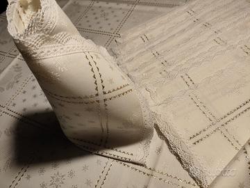 importante tovaglia natalizia con tessuto decorato con riquadri in filato dorato e bordi in pizzo, misura 185x175 cm e con 8 tovaglioli misura 45x45cm.
