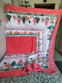 Set di tovaglia e tovaglioli con un allegro tema natalizio, perfetti per le feste. La tovaglia presenta decorazioni con alberi di Natale, Babbo Natale e scritte festive augurali. I tovaglioli NON sono coordinati con la tovaglia grande ma ben si abbinano con motivi floreali e bordi rifiniti all'uncinetto. La lunghezza della tovaglia è di 210 cm, la larghezza di 140 cm. La tovaglia NON E' mai stata utilizzata.