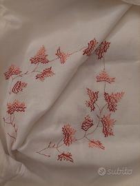 La tovaglia è ricamata a mano. Usata. Ricamo ad arte degli anni ’50. Vintage. I colori delle foglie sono molto belli. È in ottimo stato salvo macchietta eliminabile che evidenzio in foto. La tovaglia era originariamente rettangolare, ma per utilizzarla sul mio tavolo ovale Antella di Cassina l'avevo fatta modificare. Ora non ho più il tavolo. La penultima foto mostra il rovescio del ricamo., l'ultima mostra l'orlo a mano. Ha 12 tovaglioli piu’ nuovi della tovaglia perché’ meno utilizzati ed hanno orlo a mano. Dimensione 230cm x 170cm di larghezza. Ho altre foto disponibili su richiesta. Il prezzo non è trattabile. Altre foto disponobili. La tovaglia proviene da una casa in cui non è consentito fumare e non sono presenti animali domestici.