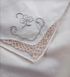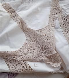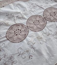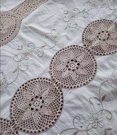 Tovaglia con 12 tovaglioli ricamata a mano con applicazioni uncinetto mai usata offro lo sconto