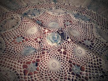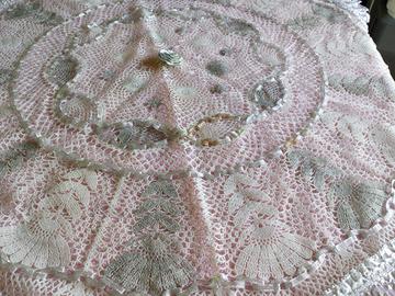 Vendo tovaglia plastificata rotonda bianca e argento con intarsi manuali