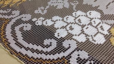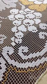 Realizzo a mano nell antico lavoro a filet a modano, pregiato pizzo nella variante bianco e oro con rose e spighe e centro dedicato alla Madonna