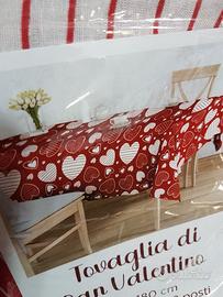 Tovaglia per la tavola a tema San Valentino, con un allegro disegno di cuori rossi e bianchi. Misura 140x180 cm ed è adatta per tavoli da 6/8 persone.